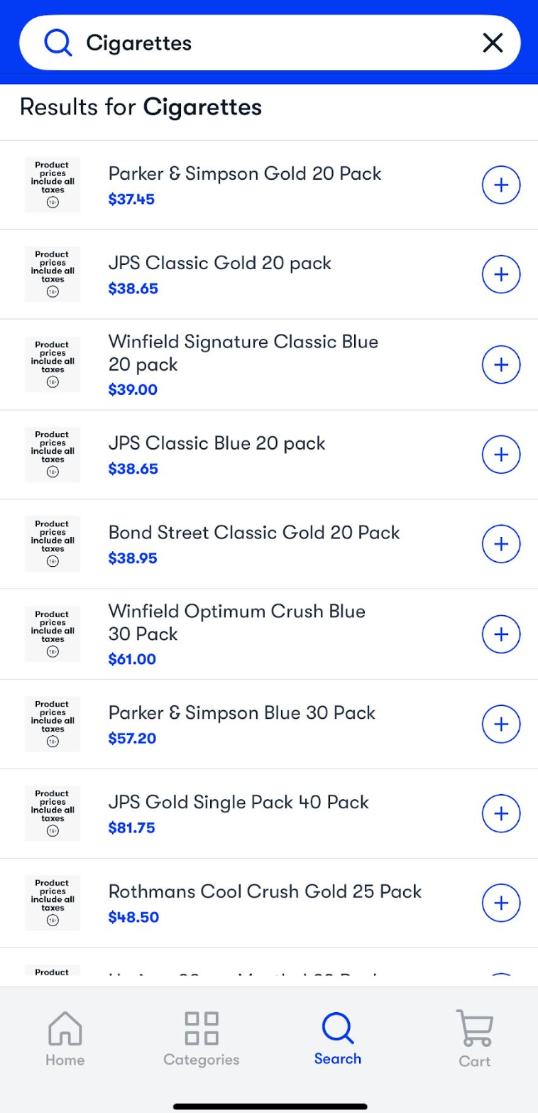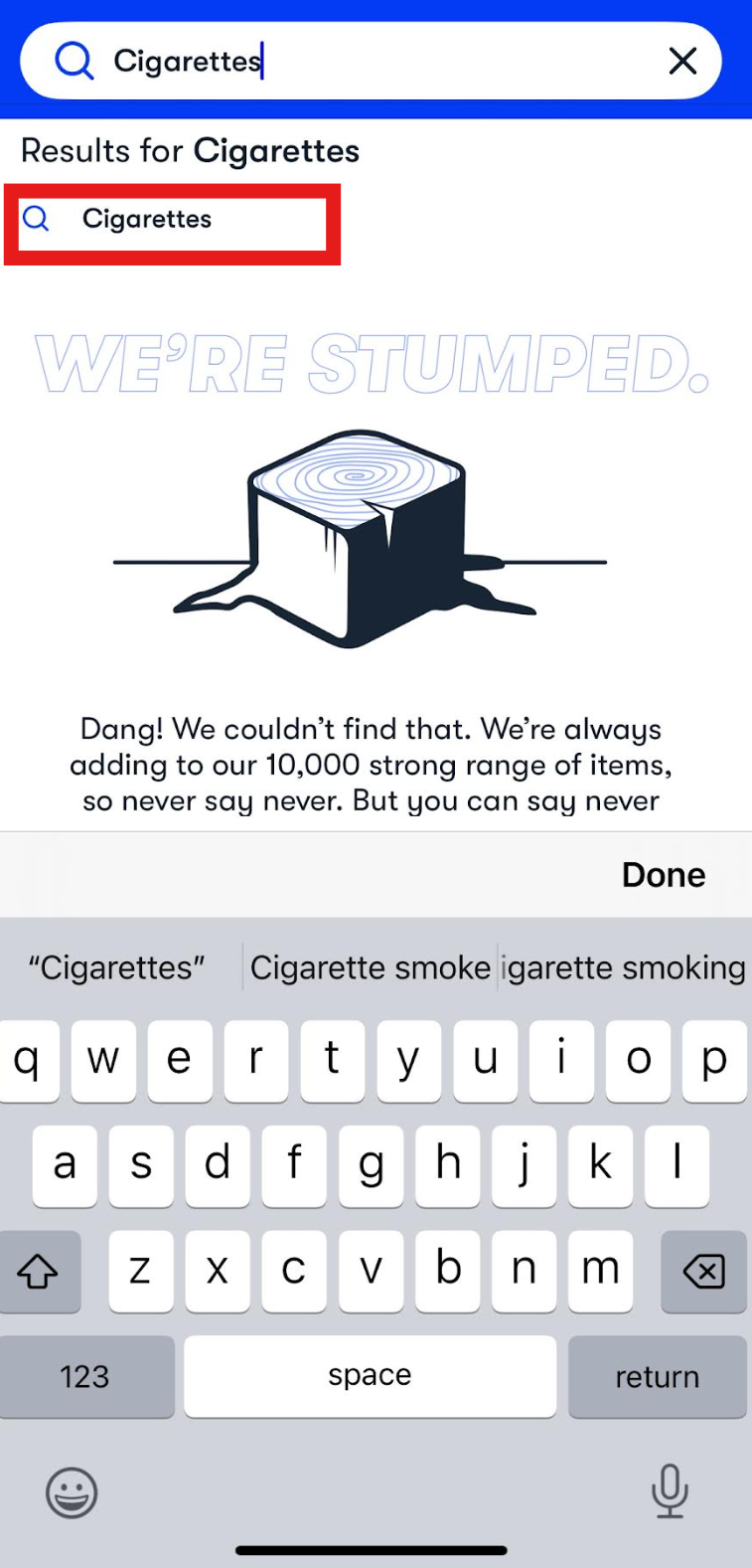 - Search for "cigarettes" or a brand of tobacco product. Note: No tobacco product will be suggested, you must hit "enter" or "return" to search.