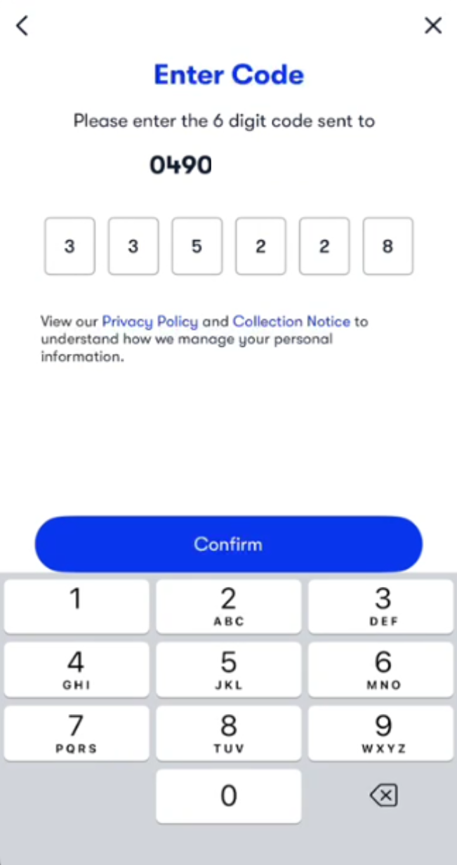 If the number is correct, click Confirm to receive your 6-digit verification code via SMS.